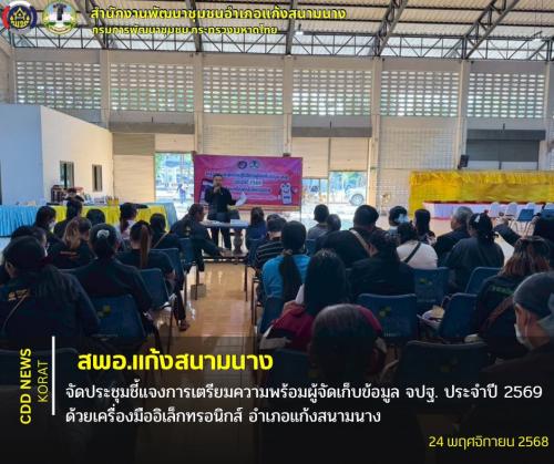 สำนักงานพัฒนาชุมชนอำเภอแก้งสนามนาง นำโดย นายสมประเสริฐ สดกลาง พัฒนาการอำเภอแก้งสนามนาง พร้อมด้วย เจ้าหน้าที่พัฒนาชุมชนอำเภอ ดำเนินการจัดประชุมชี้แจงการเตรียมความพร้อมผู้จัดเก็บข้อมูล จปฐ. ด้วยเครื่องมืออิเล็กทรอนิกส์ ประจำปี 2569 เพื่อเสริมสร้างความรู้ความเข้าใจในการจัดเก็บข้อมูลความจำเป็นพื้นฐาน (จปฐ.) ในห้วงแผนพัฒนาเศรษฐกิจและสังคมแห่งชาติ ฉบับที่ 13 ให้กับอาสาสมัครจัดเก็บข้อมูล โดยได้อธิบายตัวชี้วัดข้อมูลความจำเป็นพื้นฐาน (จปฐ.) จำนวน 5 หมวด 38 ตัวชี้วัด ทั้งนี้ ได้มีการเน้นย้ำอาสาสมัครจัดเก็บข้อมูลให้จัดเก็บข้อมูลได้อย่างมีคุณภาพ ถูกต้องตามความเป็นจริง ทันตามกำหนด และนำไปใช้ประโยชน์ได้ เพื่อให้หน่วยงานทุกภาคส่วนสามารถนำข้อมูลมาใช้พัฒนาคุณภาพชีวิตของประชาชนได้อย่างมีประสิทธิภาพ