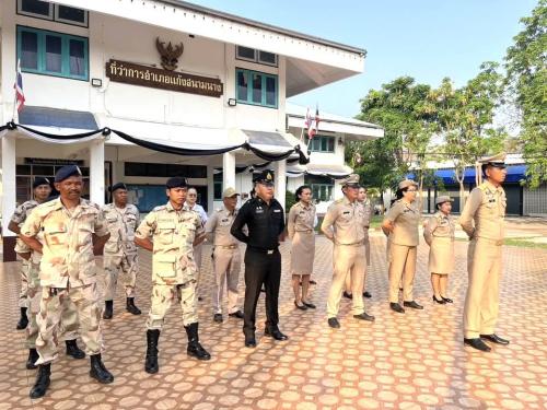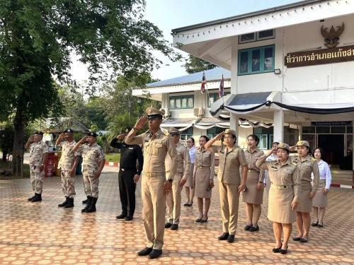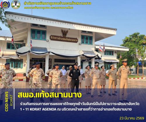 นายณเดชน์ จินดาพรหม นายอำเภอแก้งสนามนาง มอบหมายให้ นายยุทธนา ศรีนวลดี ปลัดอำเภอหัวหน้ากลุ่มงานบริหารงานปกครอง พร้อมด้วย หัวหน้าส่วนราชการประจำอำเภอ/ปลัดอำเภอ/เสมียนตราอำเภอ/พนักงานราชการ/เจ้าหน้าที่ปกครอง/สมาชิกกองอาสารักษาดินแดนอำเภอแก้งสนามนาง/ลูกจ้างที่ทำการปกครองอำเภอแก้งสนามนาง ร่วมกิจกรรมเคารพธงชาติไทย ประจำปี 2569 ณ บริเวณหน้าเสาธงหน้าที่ว่าการอำเภอแก้งสนามนาง อำเภอแก้งสนามนาง จังหวัดนครราชสีมา โดยมุ่งเน้นสร้างจิตสำนึกรักชาติและความสามัคคี ในกิจกรรมการเคารพธงชาติไทยทุกเช้าวันจันทร์เป็นไปตามวาระพัฒนาจังหวัด 1 + 11 KORAT AGENDA ที่ต้องการให้ส่วนราชการในระดับอำเภอเป็นต้นแบบในการสร้างวินัยและแสดงออกถึงความจงรักภักดีต่อสถาบันหลักของชาติ และเห็นถึงความสำคัญของธงไตรรงค์ในฐานะศูนย์รวมจิตใจของคนไทยทุกคน ณ บริเวณหน้าเสาธงที่ว่าการอำเภอแก้งสนามนาง อำเภอแก้งสนามนาง จังหวัดนครราชสีมา